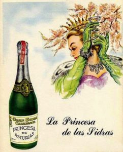 La monarquía astur también estaba presente en los nombres de la sidras champagne. Así lo vemos en la marcas Pelayo, Don Damián, Princesa de Asturias, cuyos dueños eran los de la cerveza El Águila Negra de Colloto, o Reina Victoria, de la Champanera de Villaviciosa y proveedora de la Casa Real durante años.