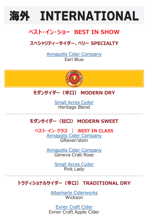 The best ciders of the competition – Best in Show – were the national Shinano Blend Sweet, from Marukame Cidery and the international Earl Blue, from Annapolis Cider Company.
